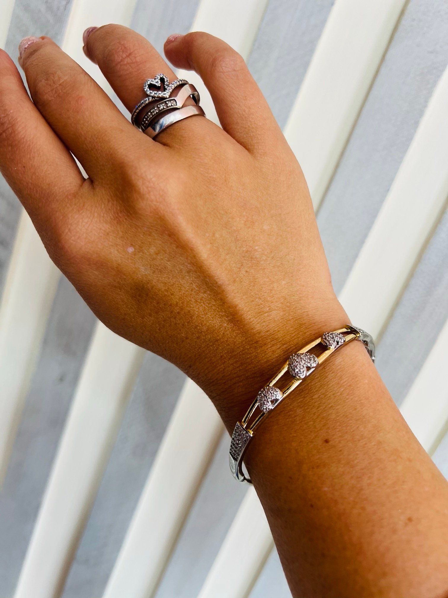 Brazalete bicolor en dorado y plata con delicadas mariposas y detalles de brillo. Ajustable, elegante y moderno, ideal para realzar cualquier look.