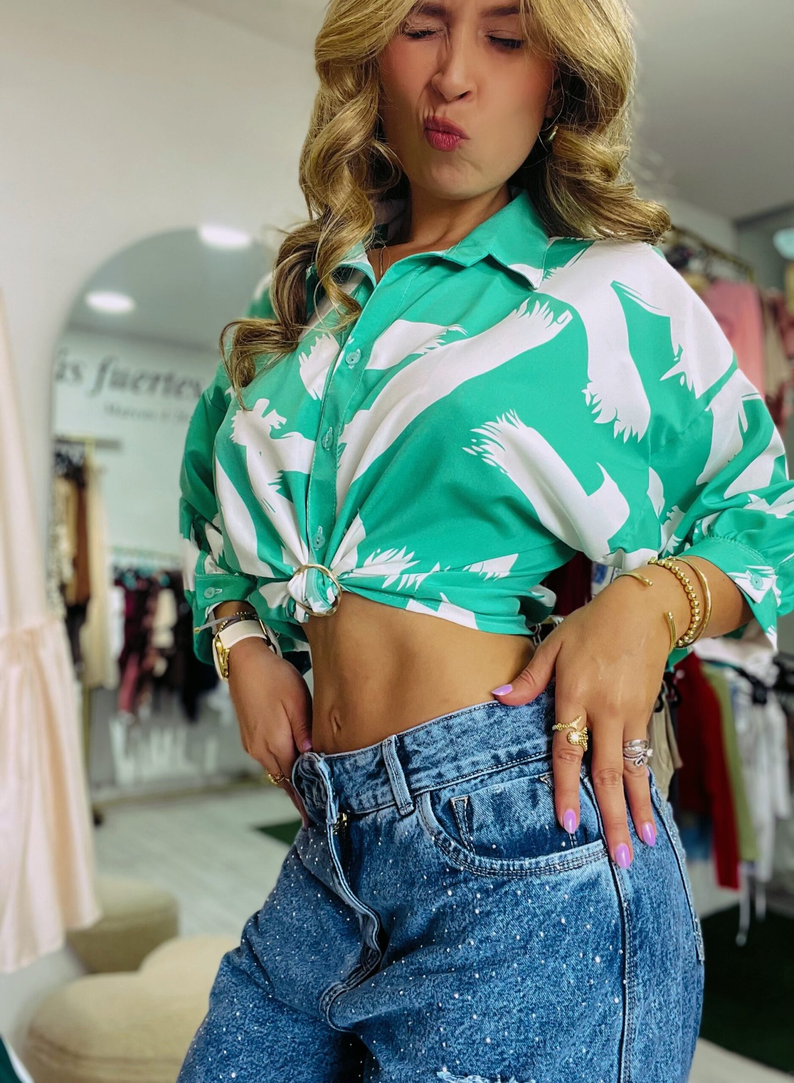 Camisera verde manzana en seda Milán con estampado blanco – fresca y ajustable
